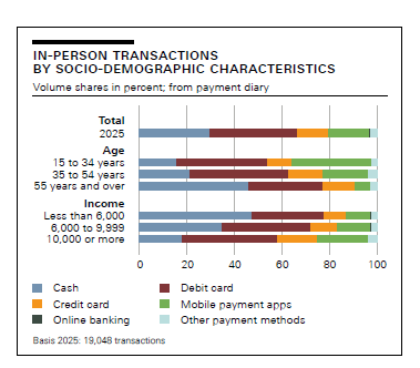 ■At the point of sale (POS), payment methods have only changed a little since 2024, with debit cards used most frequently, followed by cash. Debit cards are used for 37% of in-person transactions, cash for 30%.