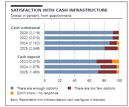 17% of respondents say there are too few access points, compared with 10% in 2024. SNB attributes this decrease in satisfaction to the fact that the number of ATMs – the most frequently used cash access point – have fallen by around 5% since the last survey. 25% of respondents are dissatisfied with the options available for depositing cash.
