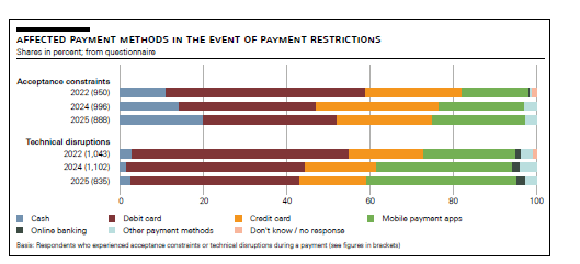 There has been a reduction in the number of situations in which technical disruptions prevented payment with the preferred payment method or in which the payment could not be completed – fewer than half of the respondents experienced a technical disruption.