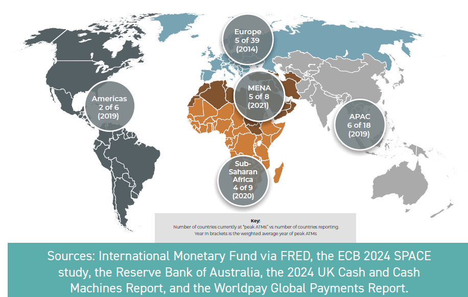 The paper states that ATMs are the single most important channel for delivering cash to the public across almost every market, with some 50-100 billion ATM transactions globally each year. However, ATM machine numbers are declining in more and more countries, and we are, it says, beyond ‘peak ATMs’.