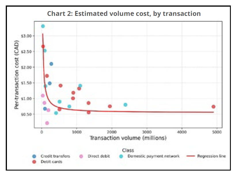 The estimated total fixed cost is approximately C$82 million per year, expressed in 2025 Canadian dollars, while the per-transaction cost is estimated at C$0.55. This result is consistent with evidence that electronic payment instruments (eg. information technology systems and card/point-of-sale terminals) have high fixed costs but comparatively low variable costs. Overall, the results point to declining average costs as volume increases.